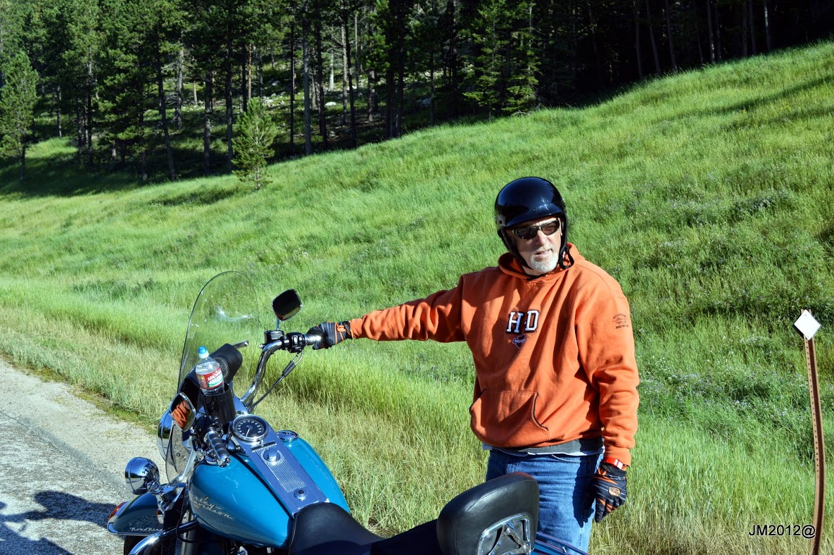 After coming out of the valley past Skiddy my mind switched gears to how a short morning cloud burst of rain made the pavement wet. I thought about how tires are pretty amazing to keep me upright going around curves in the road even while wet. At just that moment a plastic bag from Walmart came flying up at me out of nowhere. Remaining calm on the outside, I managed to contain any signs of surprise while keeping my wet tires planted firmly on the pavement. How did I know it was a Walmart bag? It got hung up on my mirror and flapped around until I could get it off. Of course my thoughts turned to how a plastic bag could be blowing around out here in the middle of nowhere, with all the barbwire fence, trees and tall grass for it to snag. So for the last three miles I’ve been thinking about chickens dressed in track suits, wet pavement and plastic bags. Is there nothing else going on in my pretty little head?